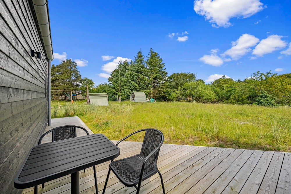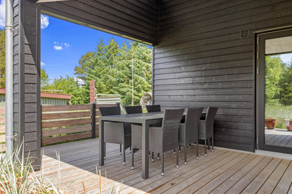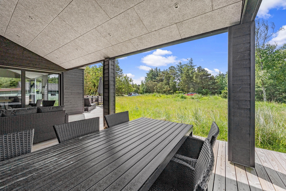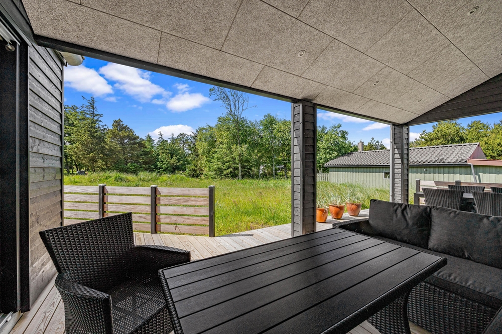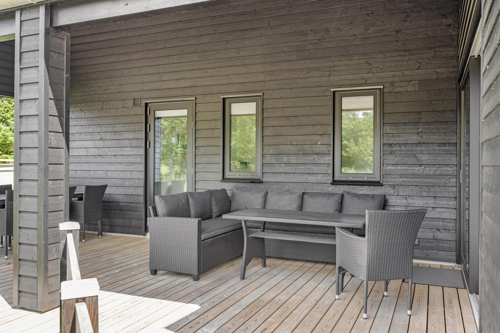 På den store terrasse har du flere dejlige steder at nyde solens varme stråler. Her står havemøbler og liggestole klar til jer, men foretrækker man hellere læ for vinden og skygge, er der også mulighed for dette under den overdækkede del af terrassen ? herunder kan I såmænd også sagtens sidde og nyde et lækkert grill-måltid, en kold sodavand eller sommerdrink for at blive kølet ned.