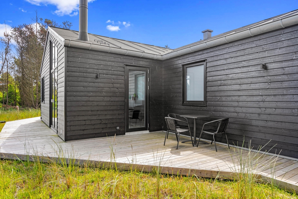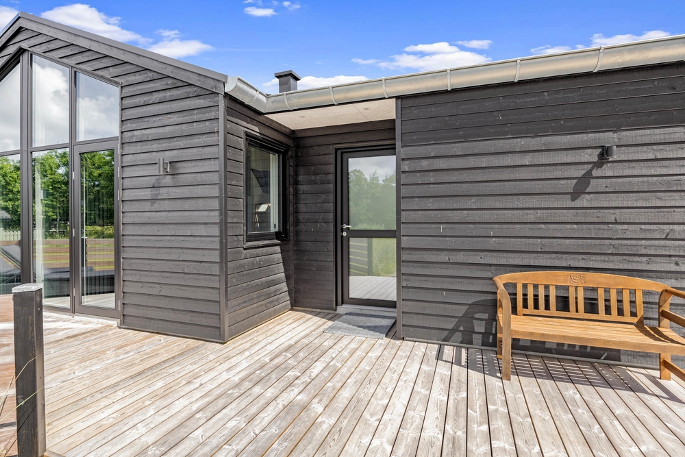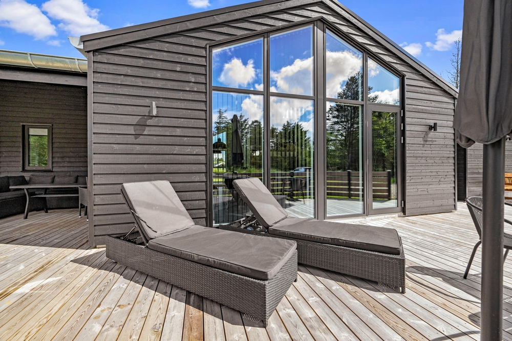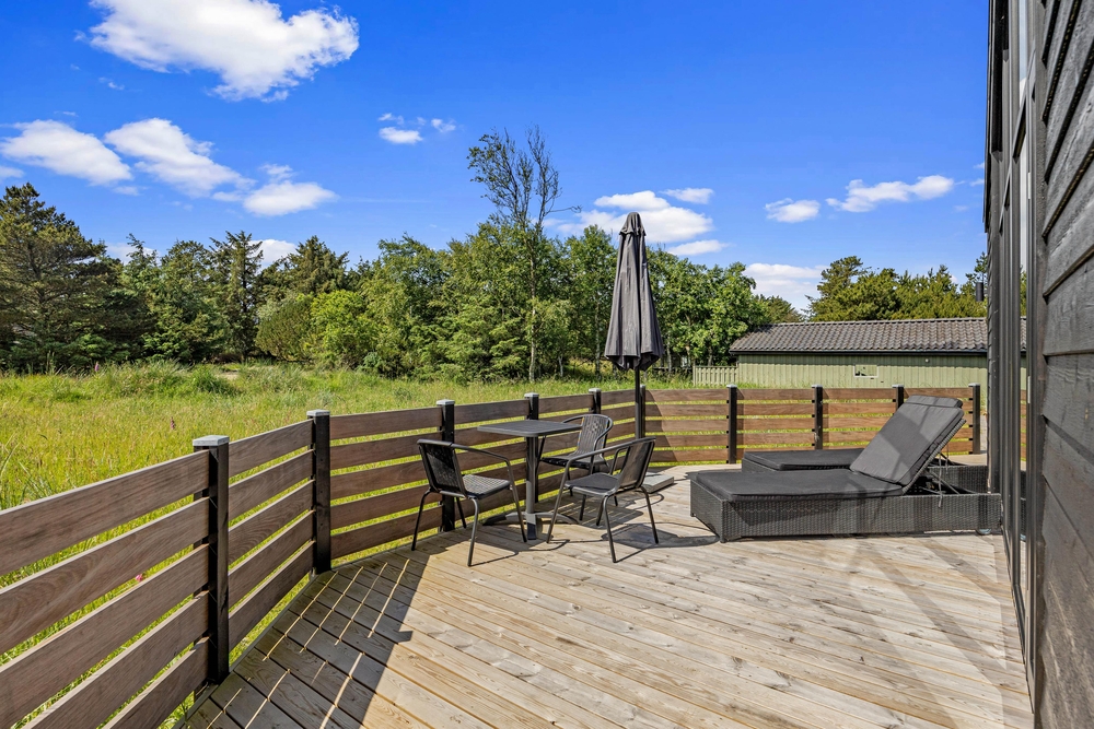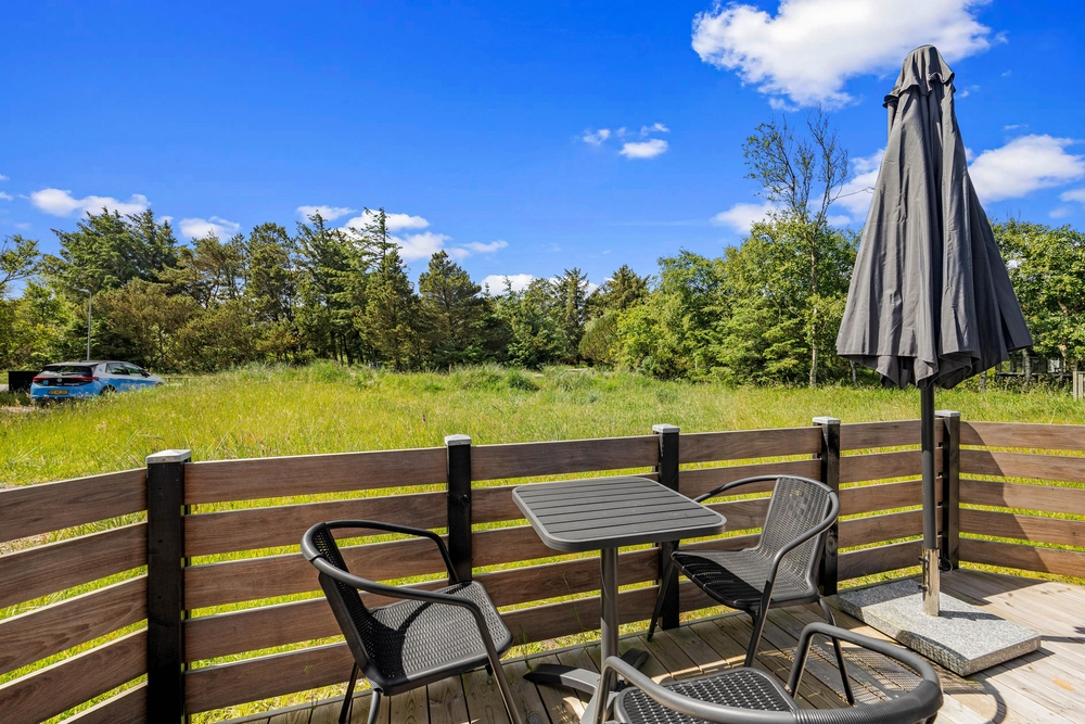 På den store terrasse har du flere dejlige steder at nyde solens varme stråler. Her står havemøbler og liggestole klar til jer, men foretrækker man hellere læ for vinden og skygge, er der også mulighed for dette under den overdækkede del af terrassen ? herunder kan I såmænd også sagtens sidde og nyde et lækkert grill-måltid, en kold sodavand eller sommerdrink for at blive kølet ned.