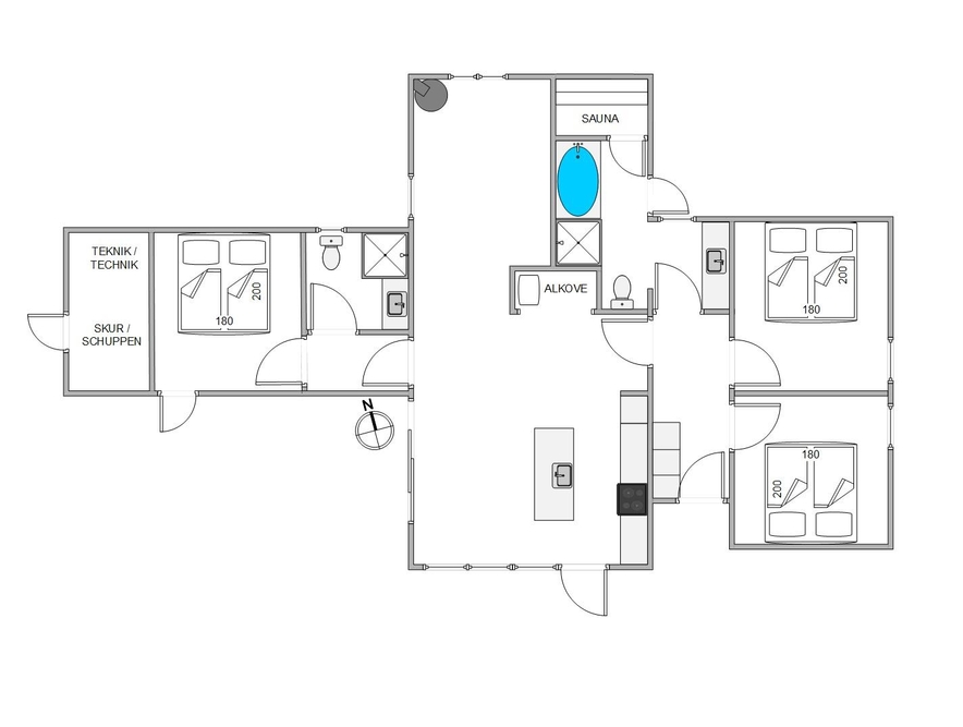 Når timerne bliver sene og solen går til køjs, kan I gøre ligeså. Her venter jer tre gode og store soveværelser, som alle sammen er udstyret med en behagelig dobbeltseng, 180×200.