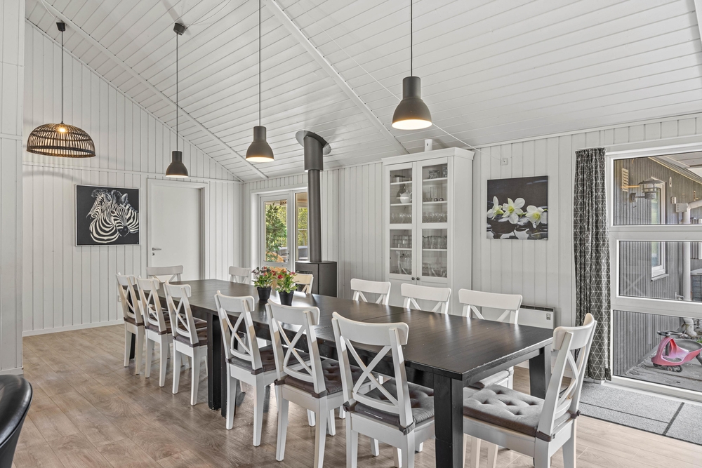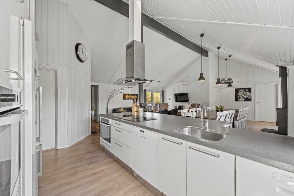 Sommerhusets hjerte er det store alrum med stue og åbent køkken i ét, hvor I kan slappe af foran den knitrende brændeovn, se film eller spille brætspil sammen. For de spilleglade er der i rummet ved siden af et poolbillardbord, der indbyder til sjove timer. Her kan I kåre feriens bedste billardspiller.