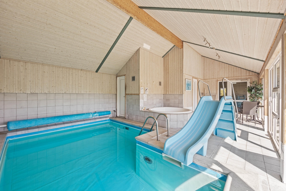 I poolrummet er I lovet mange gode stunder uanset årstiden. Poolområdet, som omfatter en 12 kvadratmeter stor pool, tilbyder masser af plads til leg og svømning for både børn og voksne. Også her finder I feriehusets sauna og spa ? perfekt til gode afslappende feriestunder og efter en lang gåtur ved Vesterhavet. For at holde energiomkostningerne nede, opvarmes poolen ved hjælp fra den energibesparende varmepumpe.