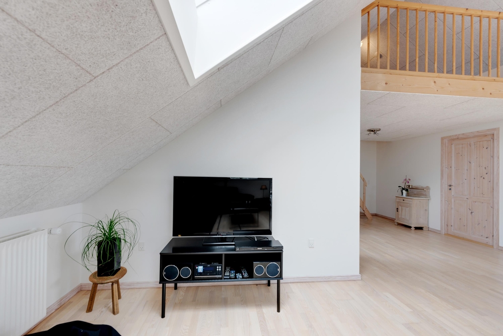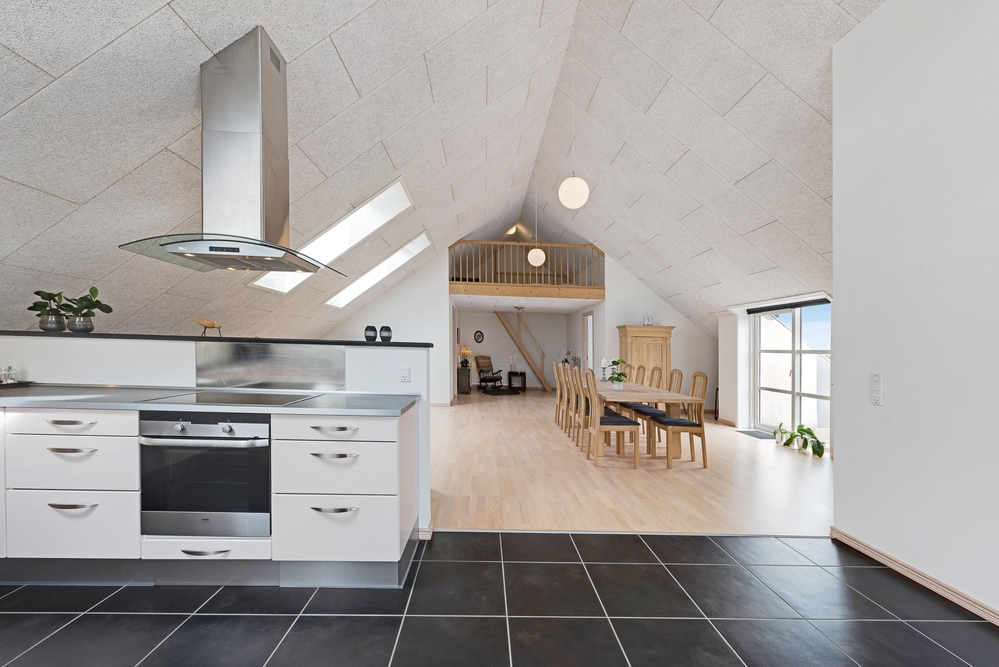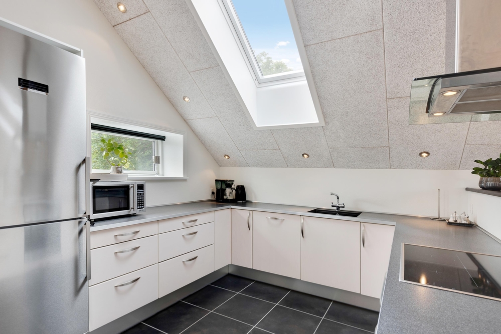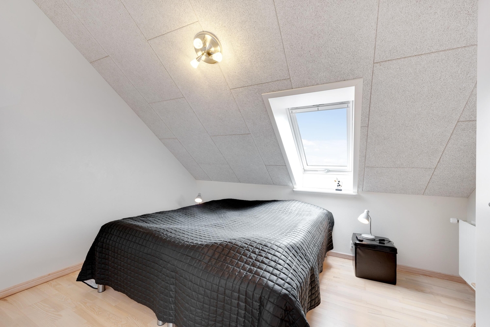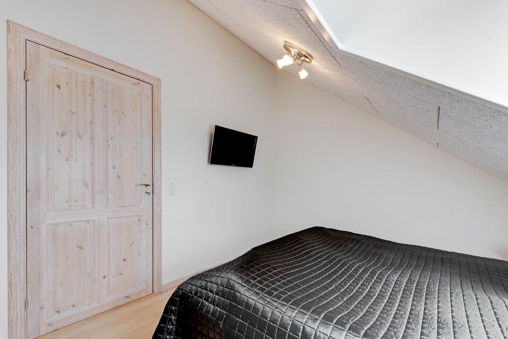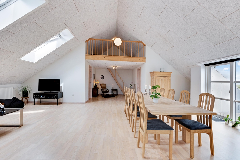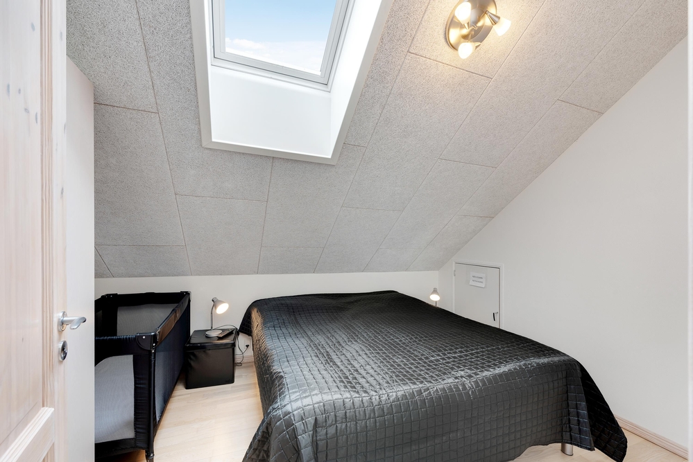 Den 122 m2 store lejlighed har loft til kip, den er dejlig lys og praktisk indrettet med 2 gode store soverum med dobbeltsenge og en fin, let tilgængelig hems med yderligere 2 sovepladser. I det moderne køkken er der induktionskomfur og naturligvis opvaskemaskine, ligesom I har både vaskemaskine og tørretumbler til jeres rådighed.