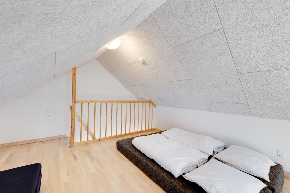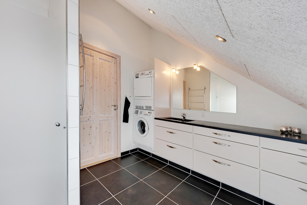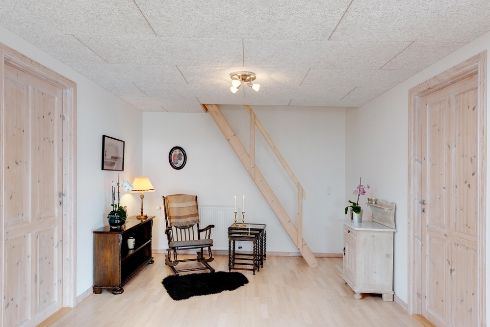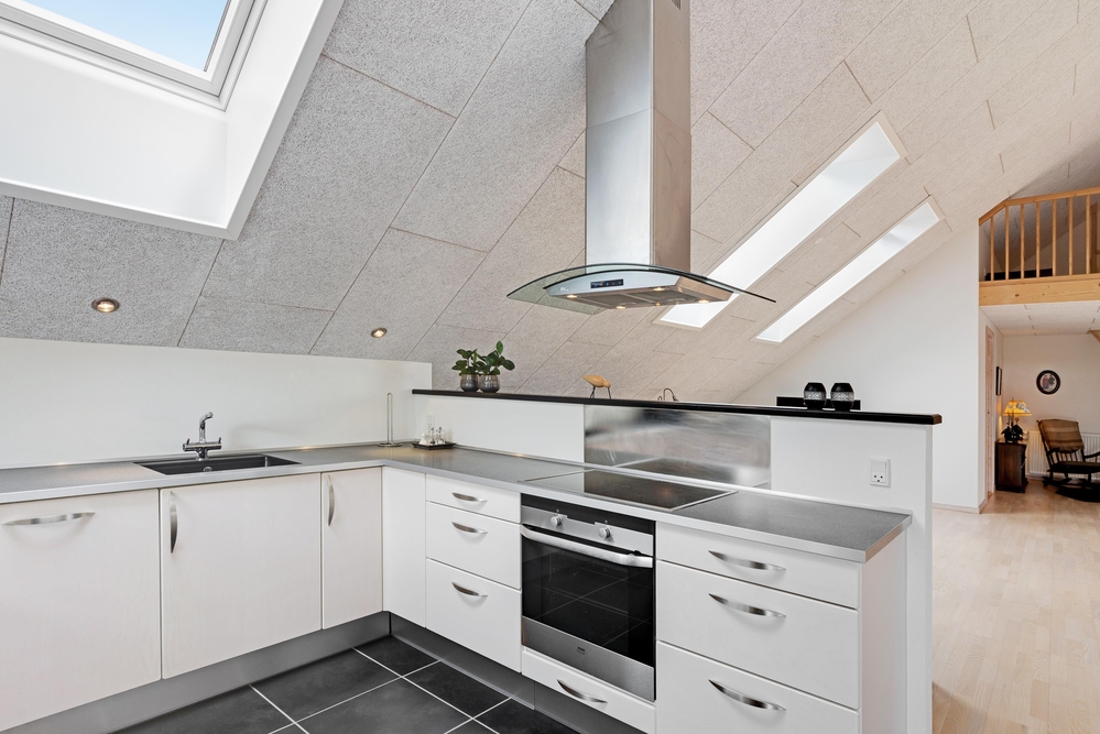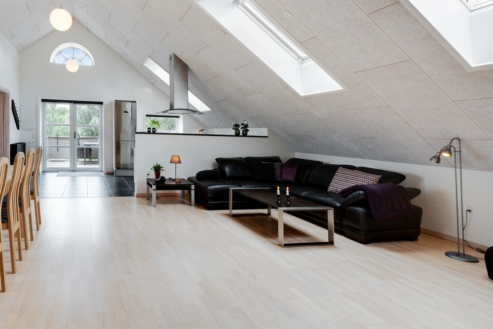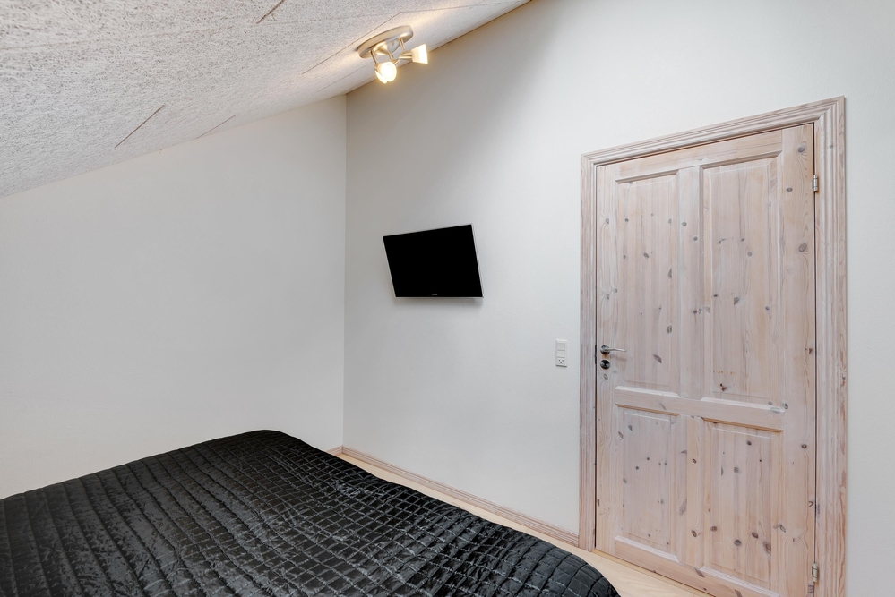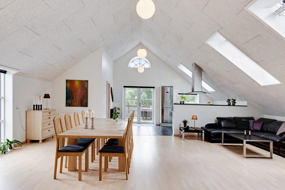 Den 122 m2 store lejlighed har loft til kip, den er dejlig lys og praktisk indrettet med 2 gode store soverum med dobbeltsenge og en fin, let tilgængelig hems med yderligere 2 sovepladser. I det moderne køkken er der induktionskomfur og naturligvis opvaskemaskine, ligesom I har både vaskemaskine og tørretumbler til jeres rådighed.