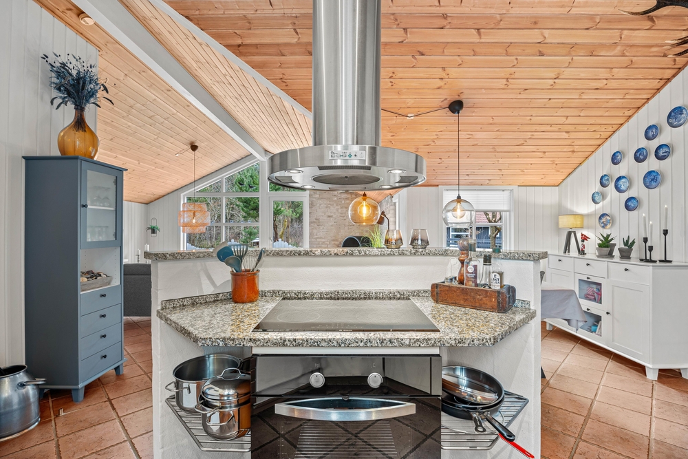 Den rummelige stue er indrettet med en behagelig stor sofa, hvor hele familien kan samles til afslappende stunder- mens I lytter til knitren fra feriehusets brændeovn. Det åbne køkken, der ligger i direkte forlængelse af stuen, skaber en hyggelig atmosfære, hvor madlavning bliver til fællesskab, mens andre måske nyder et kortspil ved spisebordet. I det tilstødende rum kan I også afholde turneringer i bordfodbold og spille om hvem, der laver aftensmaden.