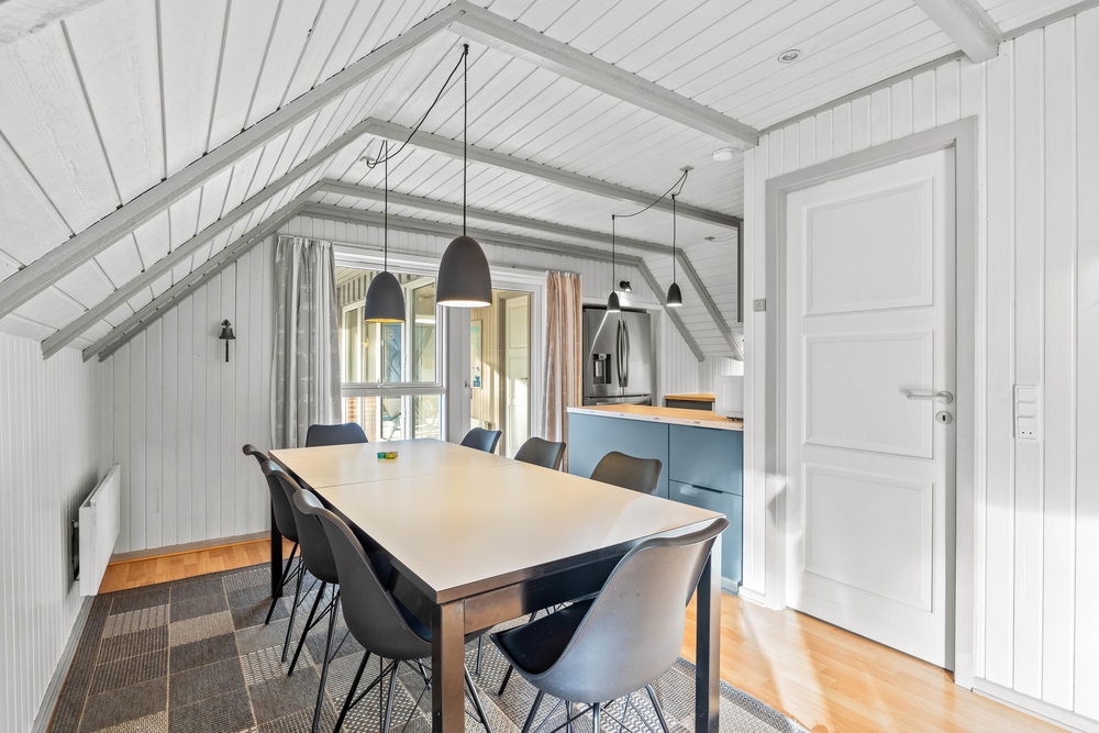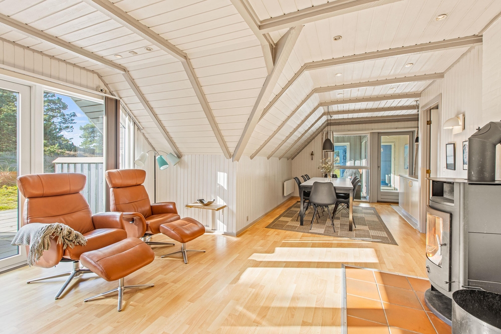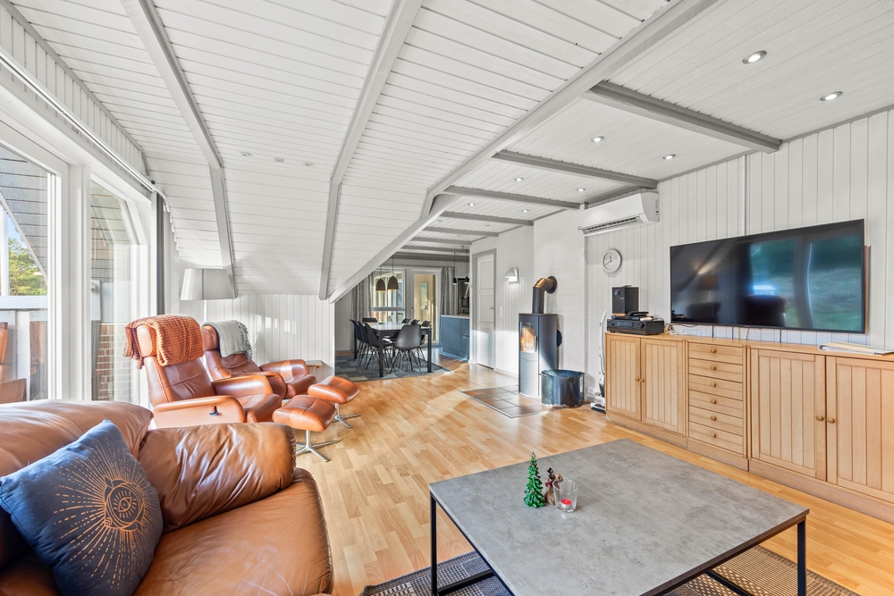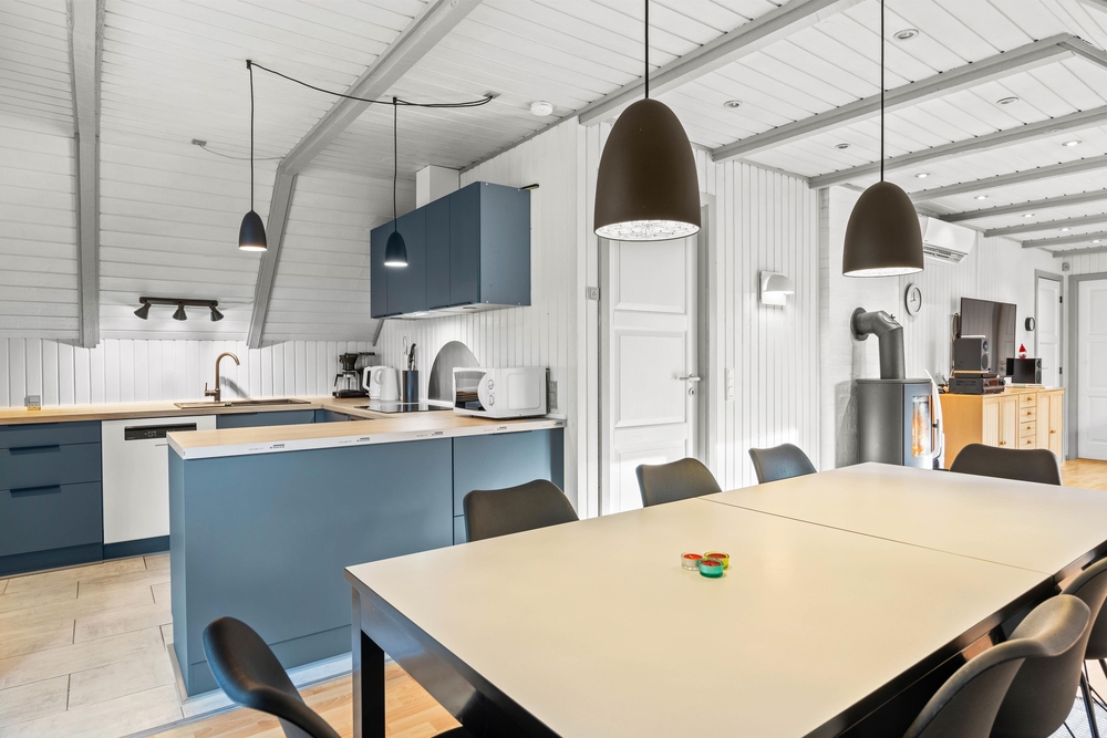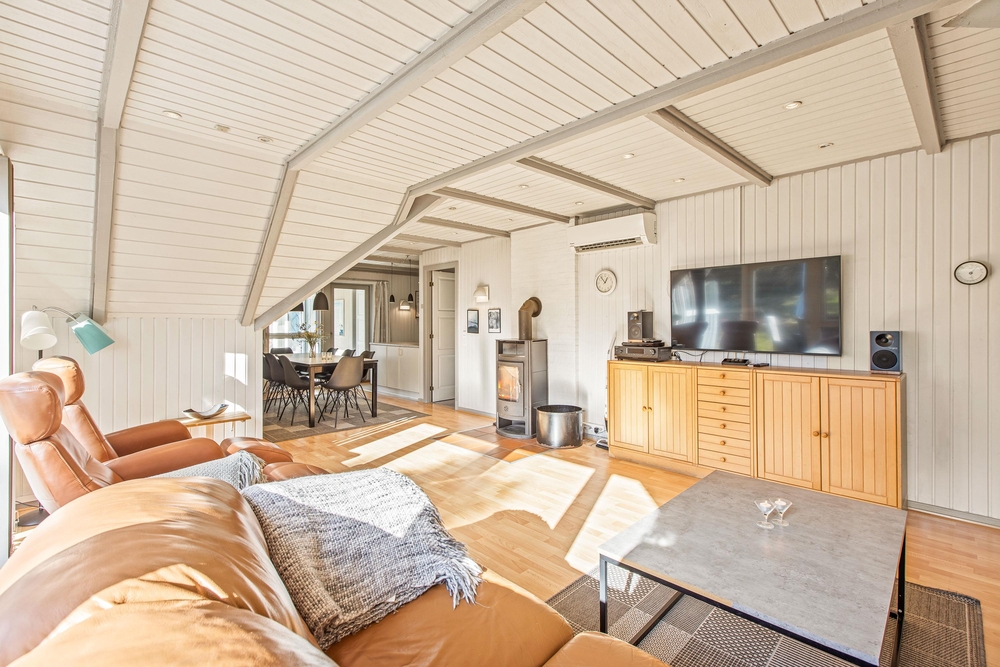 Det stråtækte hus byder med sine 185 m2 plads til 6 voksne og 2 børn/unge. Det lyse køkken med opvaskemaskine ligger i åben forbindelse med spisestuen og stuen. Opholdsstuen er hyggeligt indrettet og har en behagelig størrelse. En brændeovn, som i den kølige tid hurtigt giver varme, desuden er der en energibesparende varmepumpe.