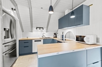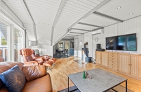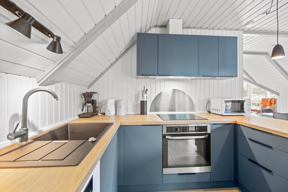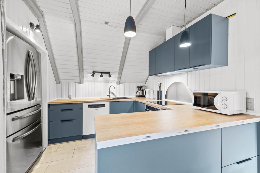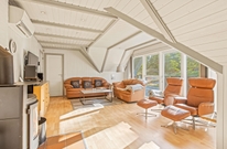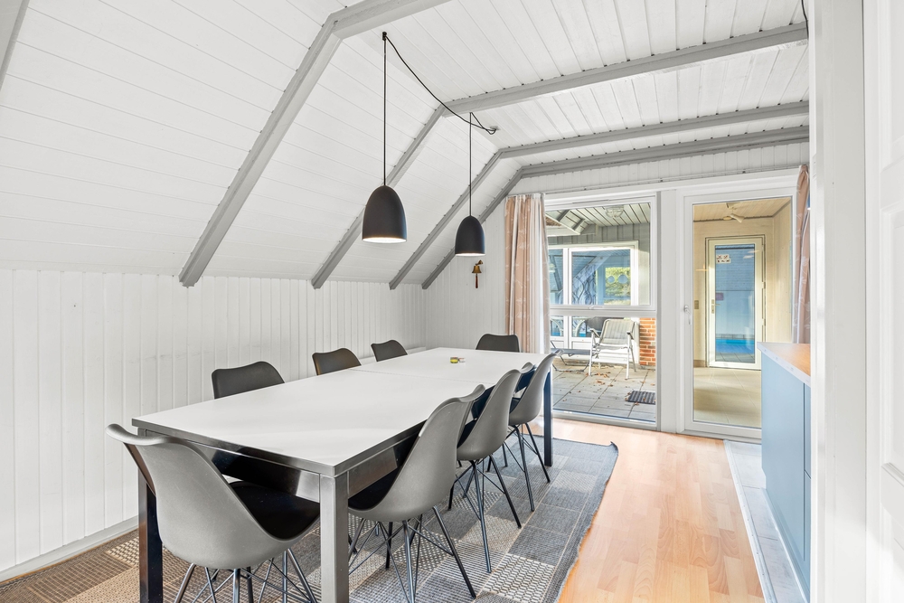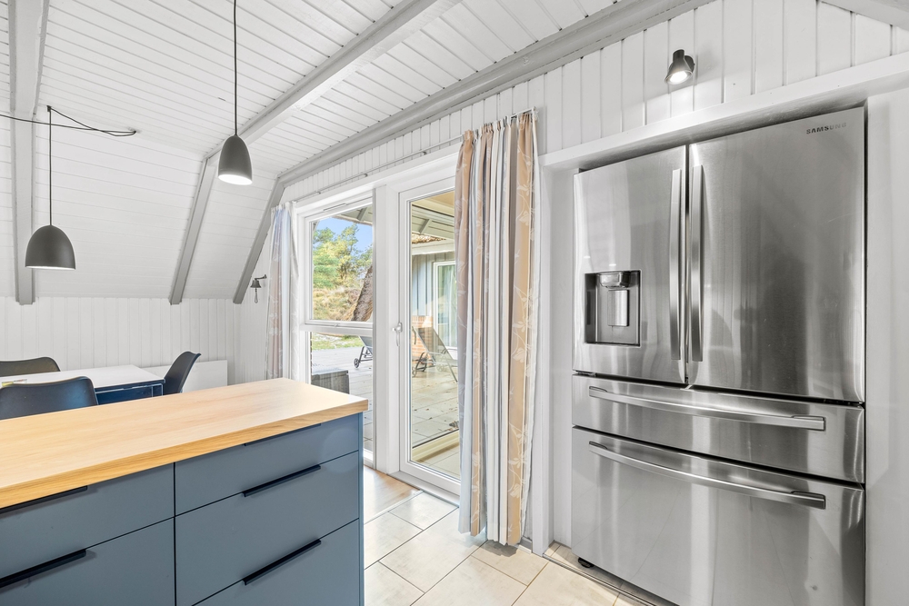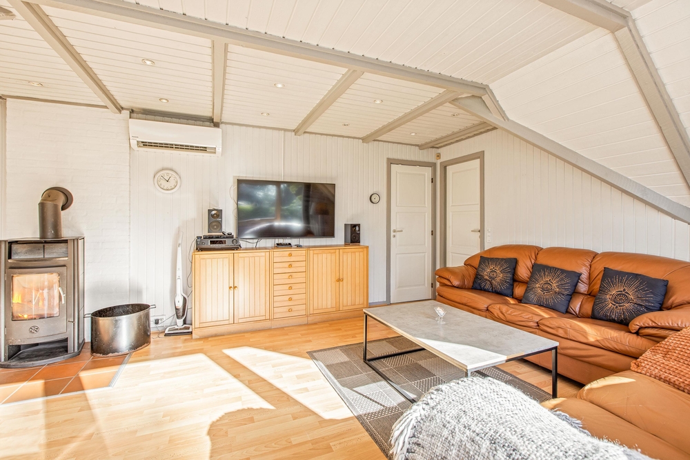 Det stråtækte hus byder med sine 185 m2 plads til 6 voksne og 2 børn/unge. Det lyse køkken med opvaskemaskine ligger i åben forbindelse med spisestuen og stuen. Opholdsstuen er hyggeligt indrettet og har en behagelig størrelse. En brændeovn, som i den kølige tid hurtigt giver varme, desuden er der en energibesparende varmepumpe.