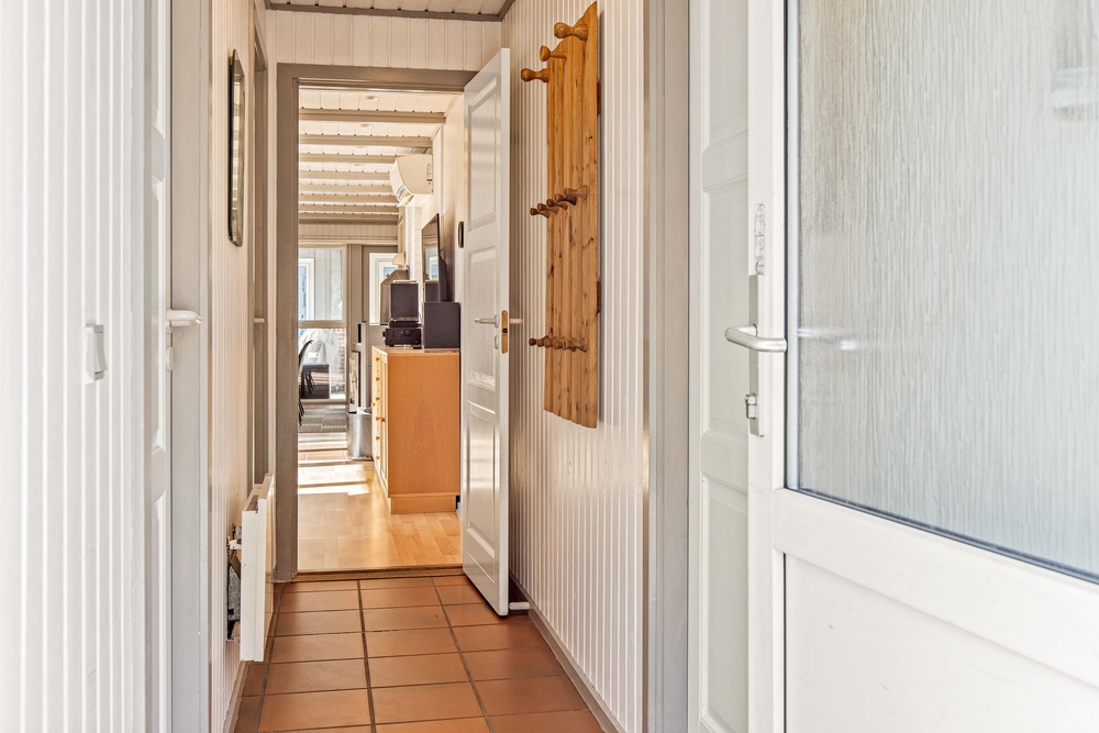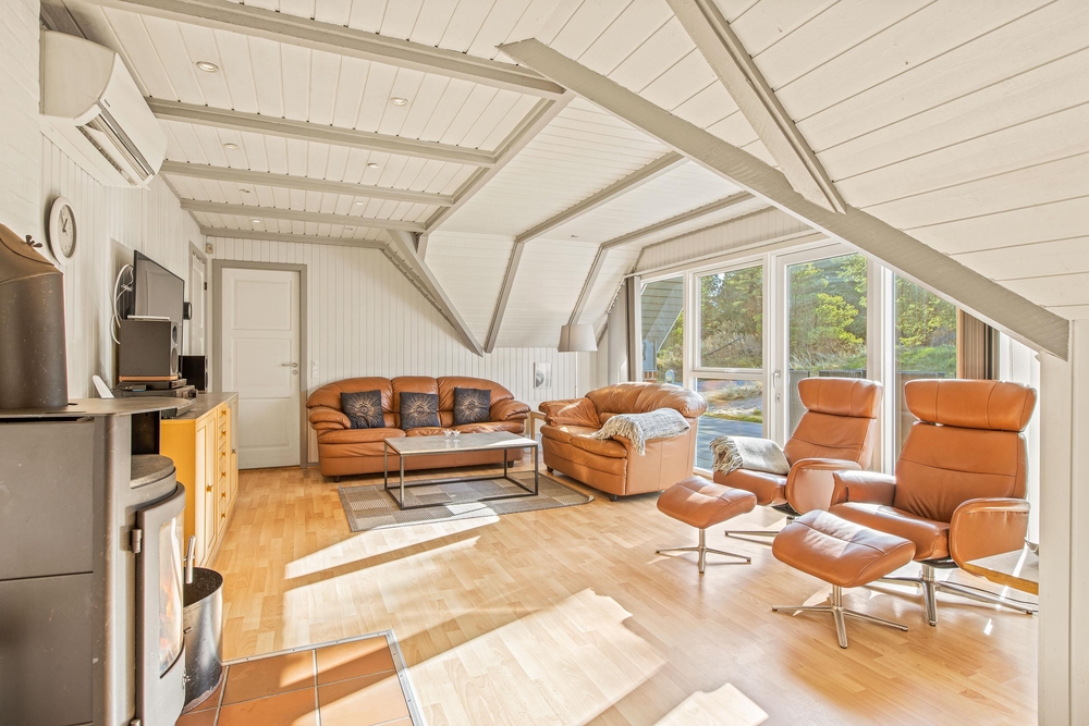 Udenfor indbyder den dejlige sydvendte terrasse med havemøbler til afslapning, imens de små kan hygge sig med gynge og sandkasse på den børnevenlige lynggrund.