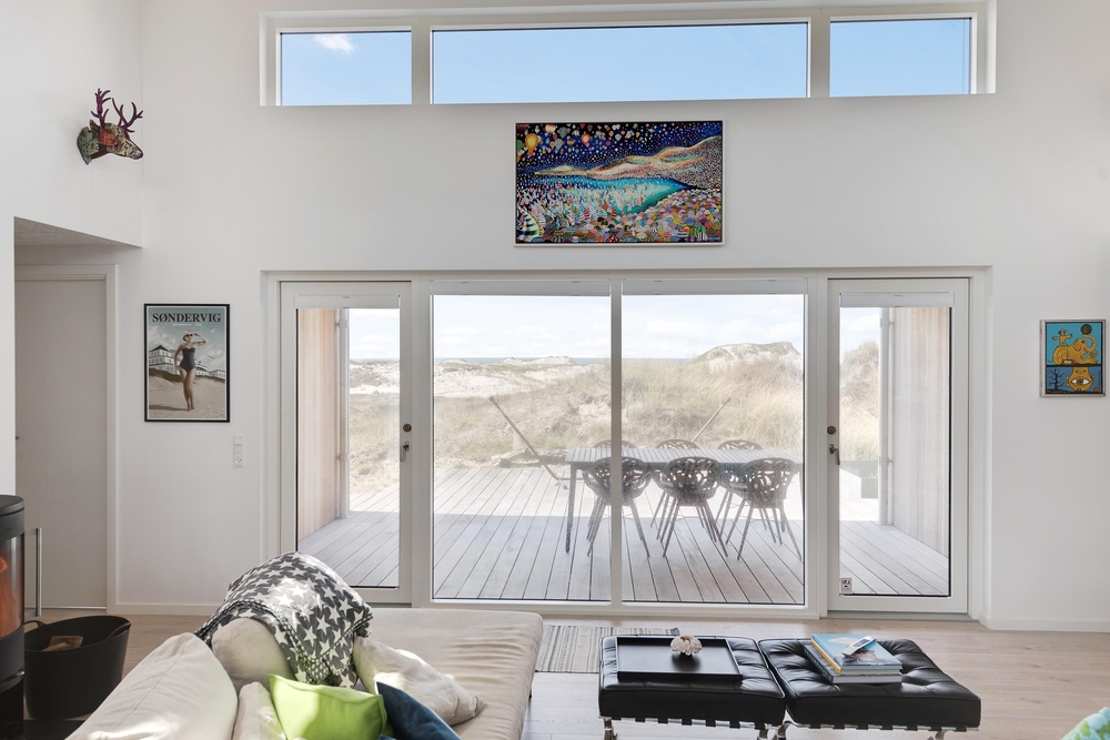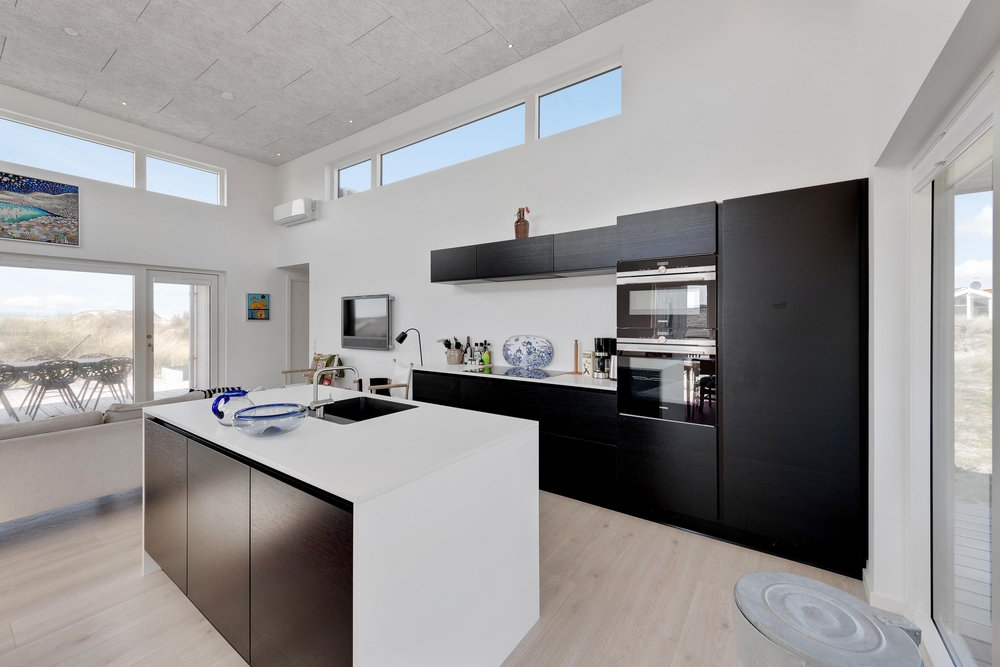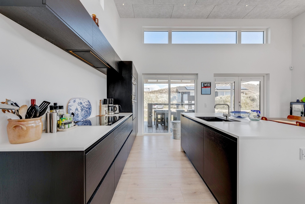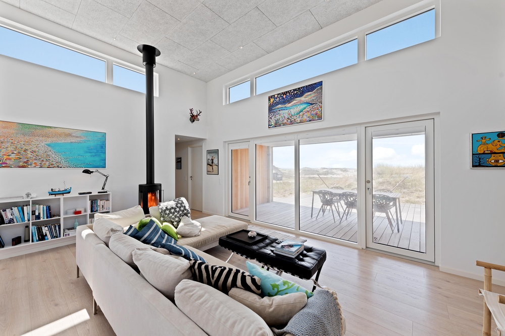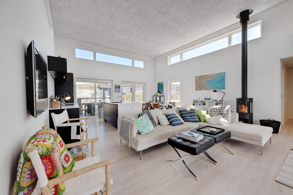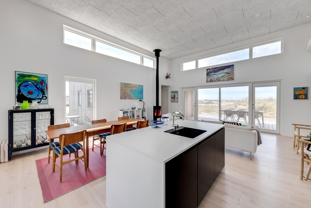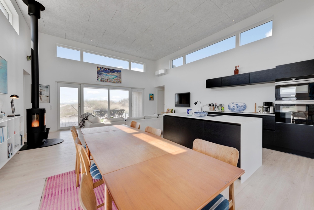 De store glaspartier i stuen ud mod terrasserne byder på en fantastisk panoramaudsigt til havet og klitlandskabet, og de sørger samtidig for et skønt lysindfald i huset, så I kan nyde det helt særlige lys ved havet ? også i de koldere måneder, hvor aftener tilbringes med hygge foran den knitrende brændeovn. Det åbne køkken med indbygget køleskab indbyder desuden til fælles madlavning og til at kræse lidt ekstra om menuerne i ferien. Her er også kræset for detaljerne, eftersom alle møbler er bevidst valg for at give jer komfort samt skabe en stilfuld indretning. Her er også højt til loftet, hvilket er med til at give rummene en dejlig rummelighed og få jer helt ned i gear.
