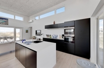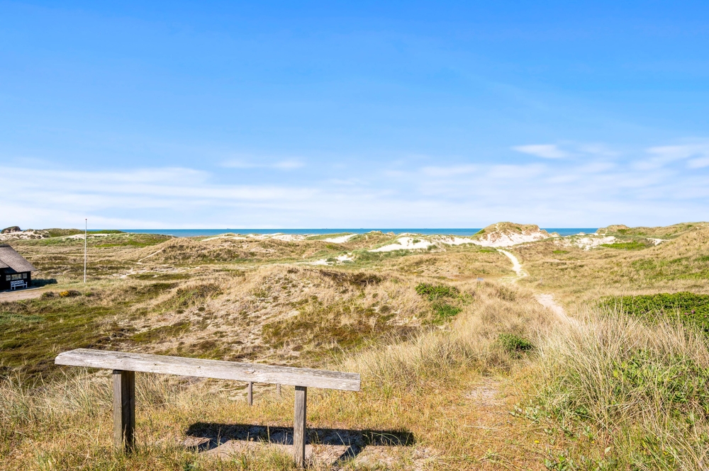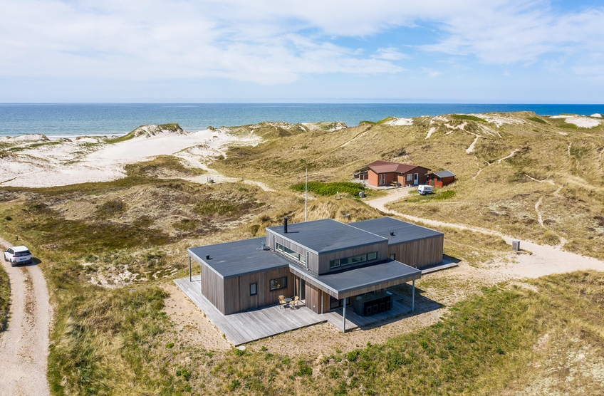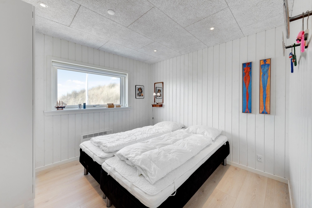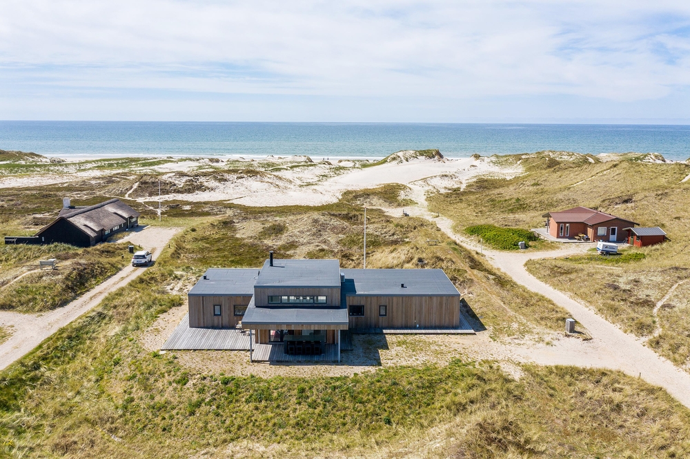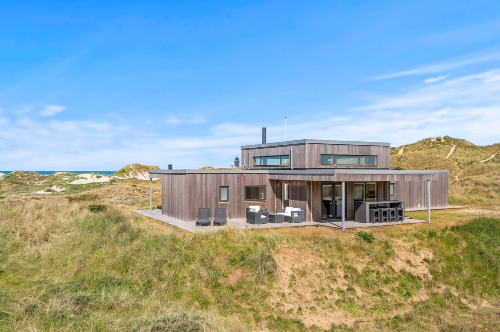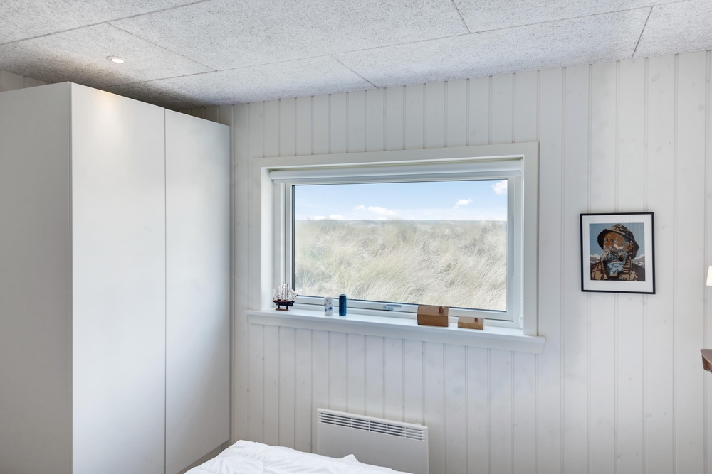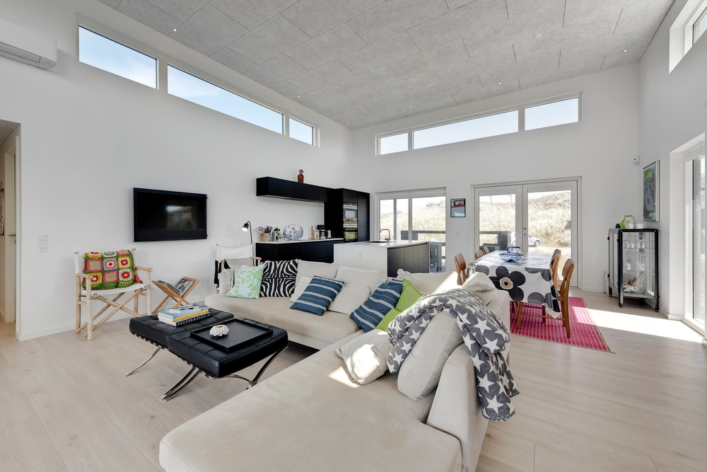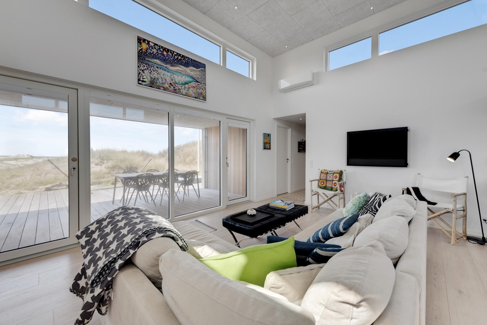 De store glaspartier i stuen ud mod terrasserne byder på en fantastisk panoramaudsigt til havet og klitlandskabet, og de sørger samtidig for et skønt lysindfald i huset, så I kan nyde det helt særlige lys ved havet ? også i de koldere måneder, hvor aftener tilbringes med hygge foran den knitrende brændeovn. Det åbne køkken med indbygget køleskab indbyder desuden til fælles madlavning og til at kræse lidt ekstra om menuerne i ferien. Her er også kræset for detaljerne, eftersom alle møbler er bevidst valg for at give jer komfort samt skabe en stilfuld indretning. Her er også højt til loftet, hvilket er med til at give rummene en dejlig rummelighed og få jer helt ned i gear.