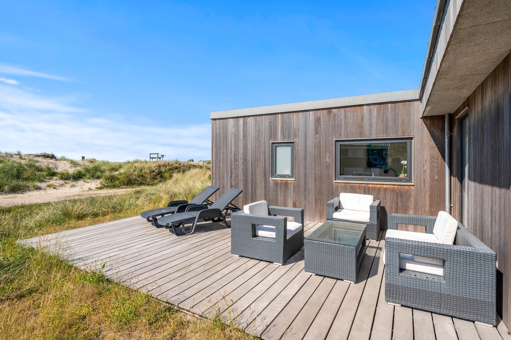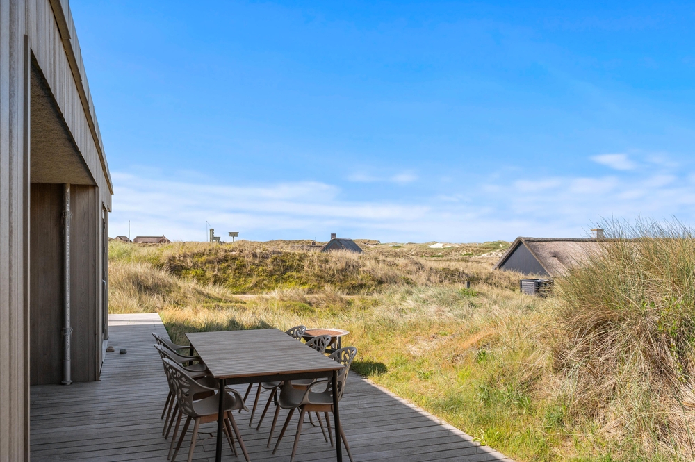 Blot et stenkast fra huset ligger den endeløse sandstrand og det brusende Vesterhav, som I kan nyde lyden af hjemme på husets terrasse ? hvor der i øvrigt er installeret en udebruser, I kan skylle sandet af under efter strandturene. Udebrusen kan bruges i perioden april til november.