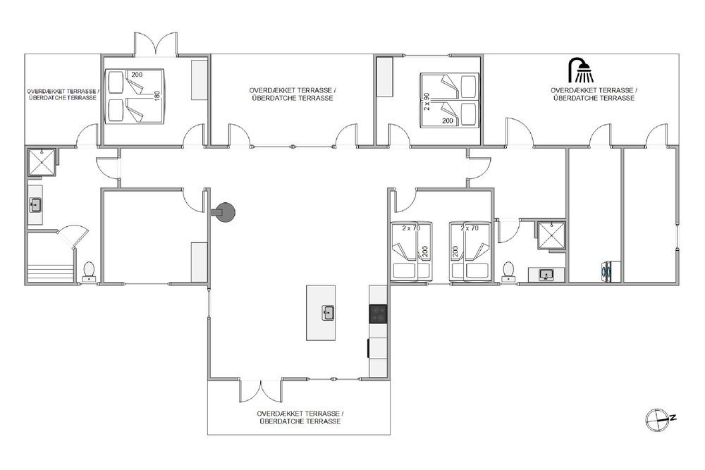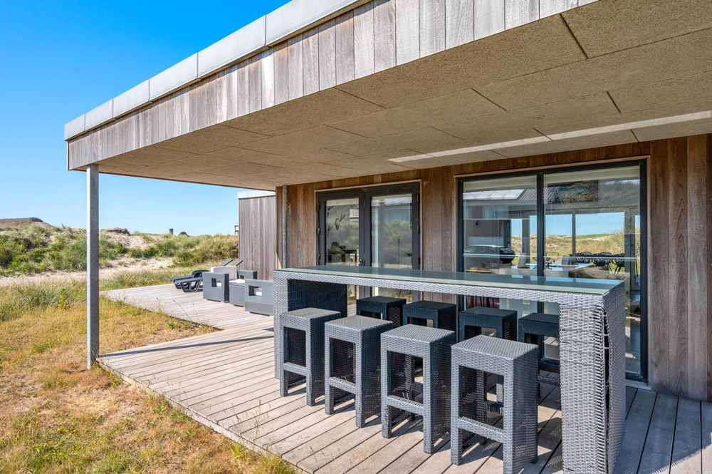 Wow! Andet er der vist ikke at sige. Rundt om huset er der bygget en stor terrasse, som er delvist overdækket, så I altid kan finde både sol, skygge og læ for vinden, hvad enten I vil grille, solbade eller nyde en kold drink.